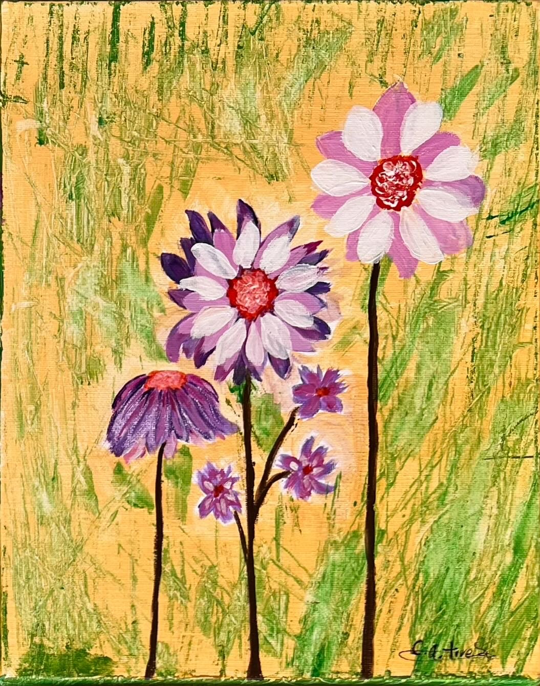 Obra original de C.A. Trueba pintada en acrílico sobre lienzo de 24 x 30 cm. A través de las flores la artista nos acerca a su momento personal. El color se convierte en su principal vehículo de comunicación, reflejando una conexión directa entre su sentimiento y su proceso creativo. Sus obras emanan espontaneidad, creatividad, intuición y fuerza.